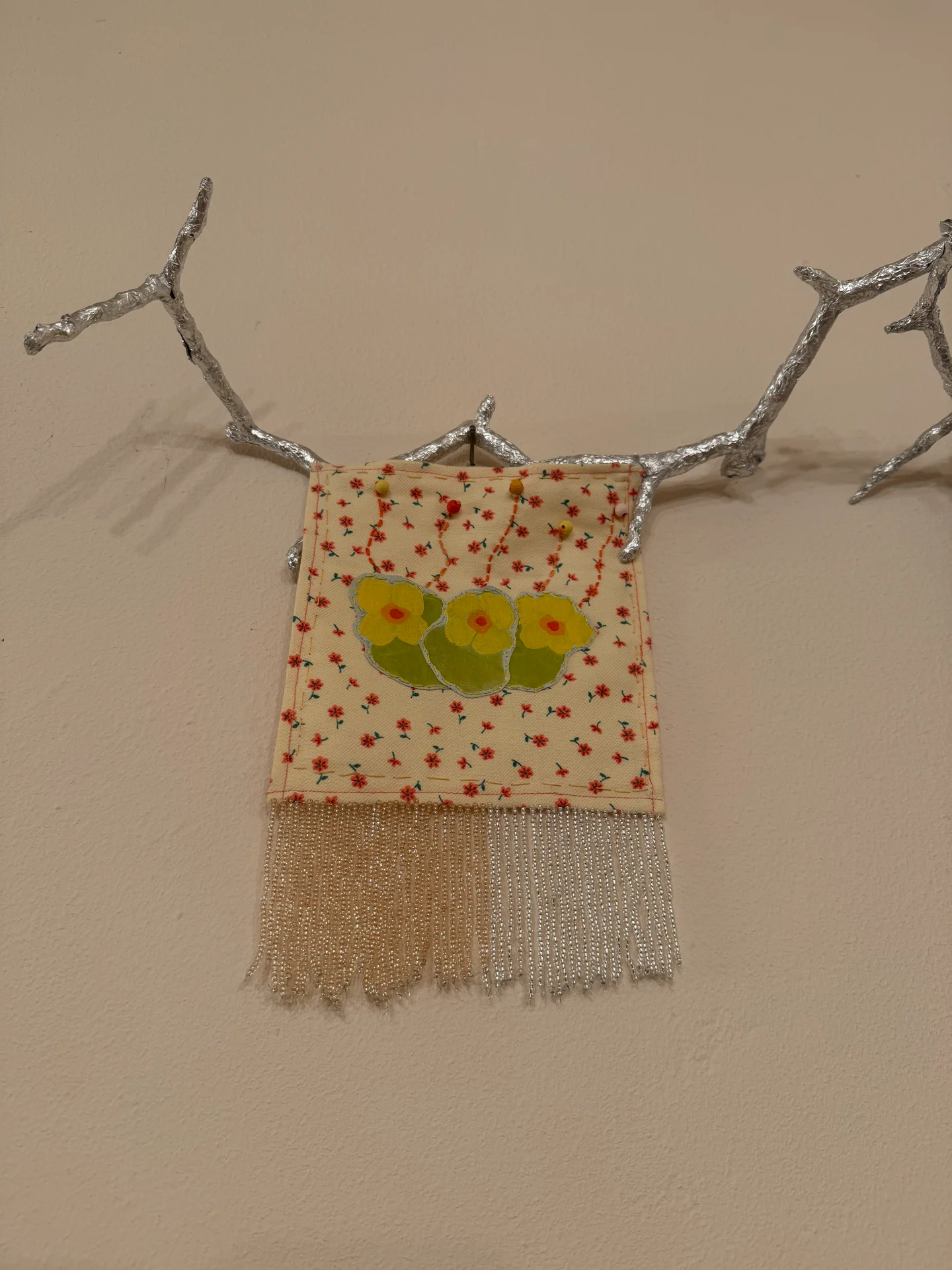 Some of the fabrics used here were aprons of my great grandma mixed with trimmings and elements that I collected in the forests of the Valley (including the silver branches).