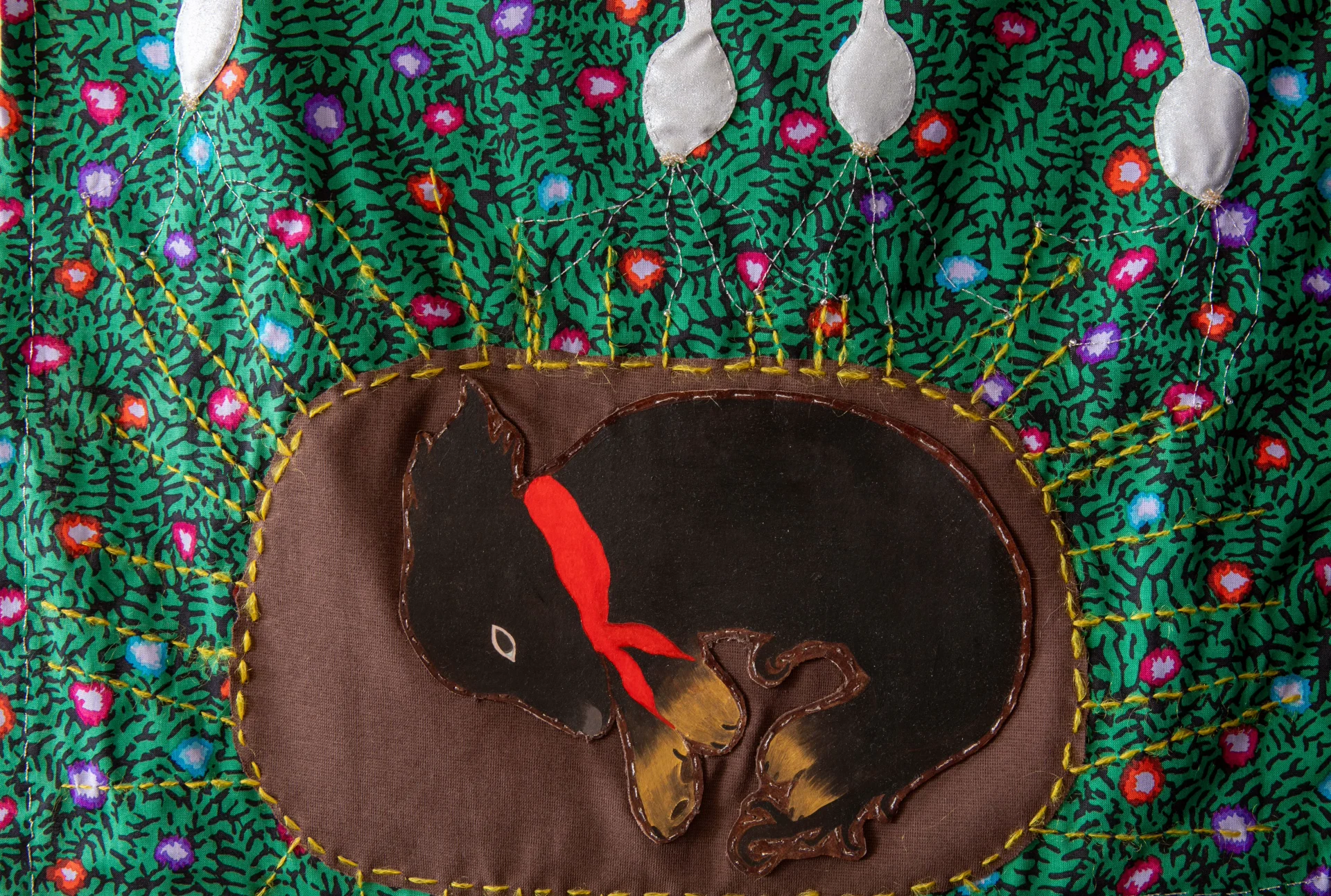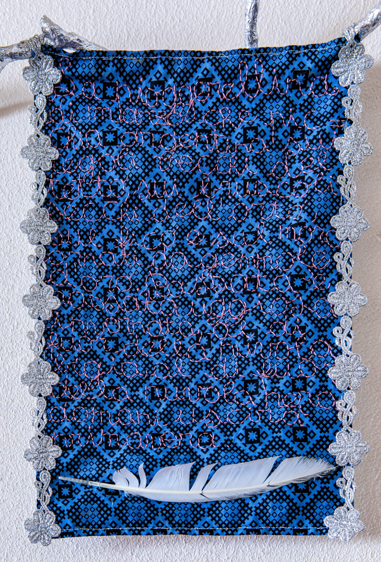 In Italien ist diese Nähtechnik, die mit Stickerei verbunden ist, sehr alt und wird üblicherweise von Großmüttern an ihre Enkel oder von Müttern an ihre Töchter weitergegeben. Ich habe mein Wissen von den Frauen meiner Familie erlangt, erzähle Geschichten und zeige Bilder, indem ich nähe. Es sind Bilder aus meiner Kindheit und von den Abenteuern im Tal. Einige der verwendeten Stoffe stammen von Schürzen meiner Urgroßmutter und wurden mit Borten und Elementen kombiniert, die ich in den Wäldern des Tals gesammelt habe, darunter auch Silberzweige.