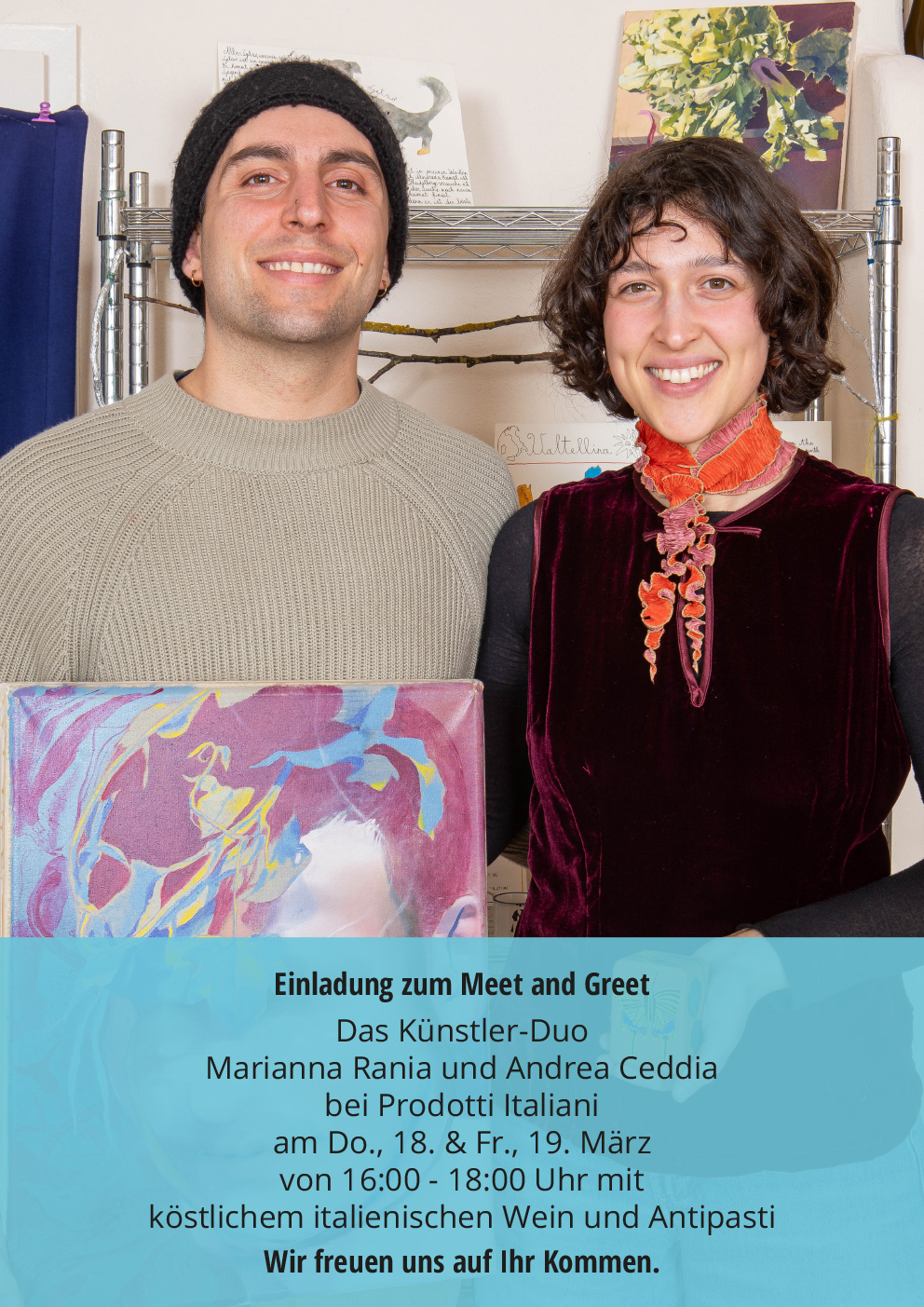 Alber und Loh planen Meet and Greets mit dem jungen Künstlerpaar bei Prodotti Italiani – selbstverständlich mit Verkostung.